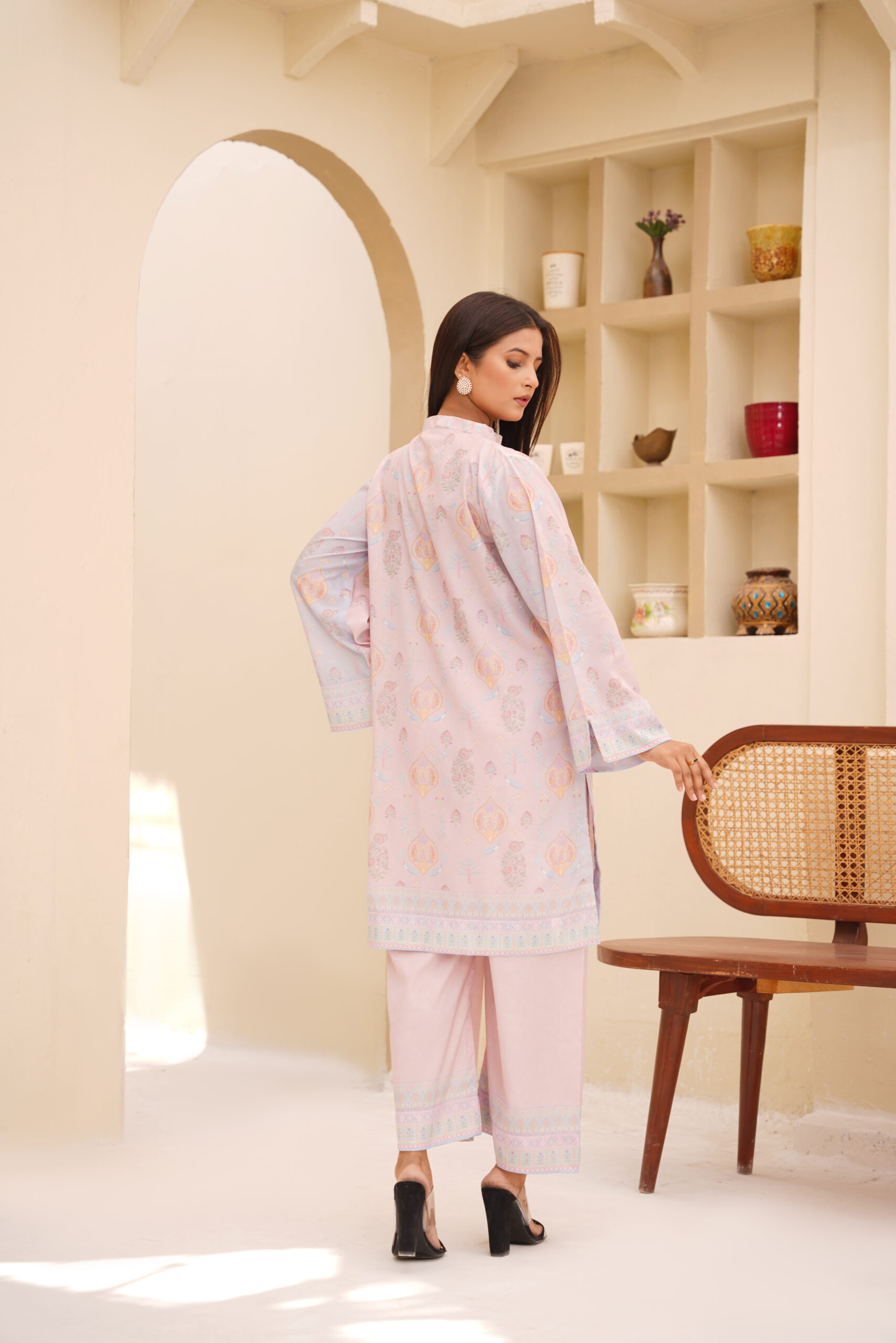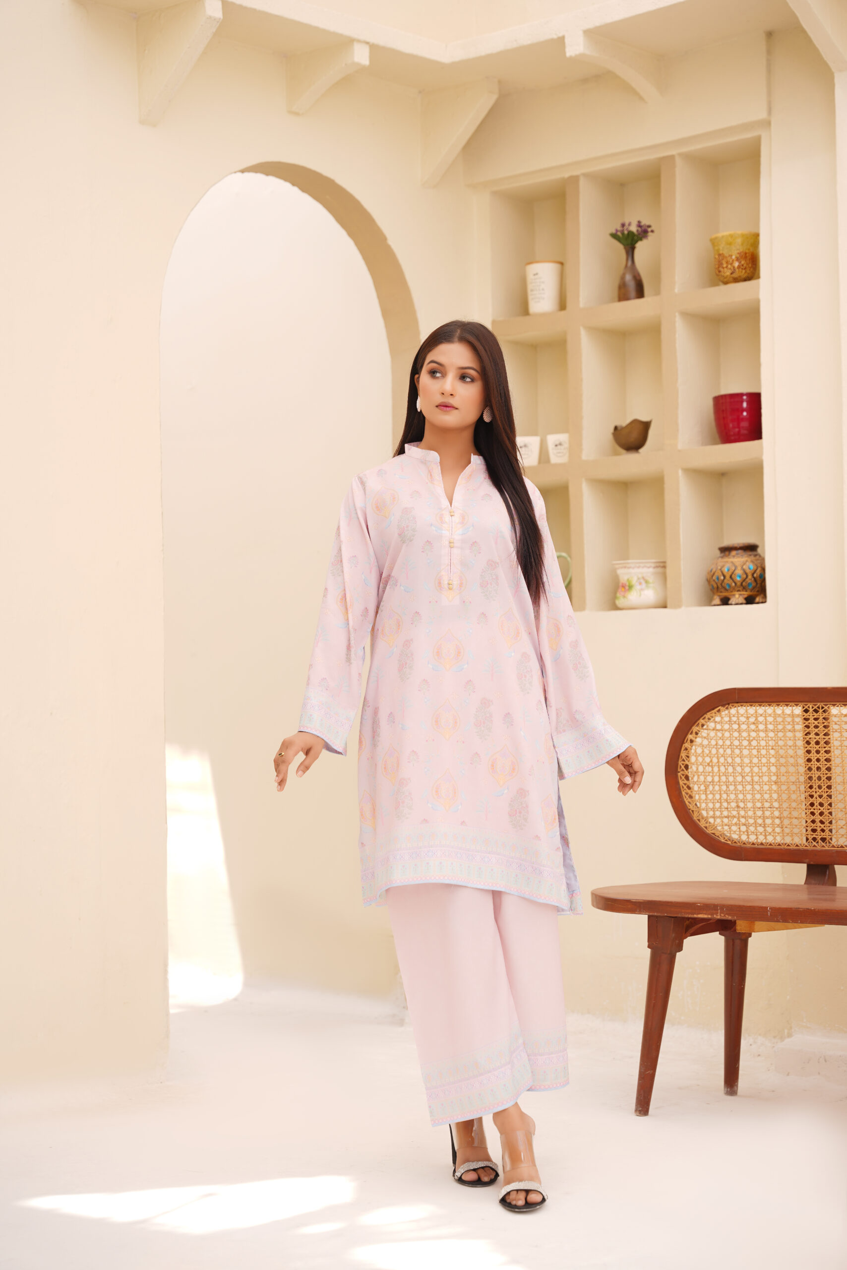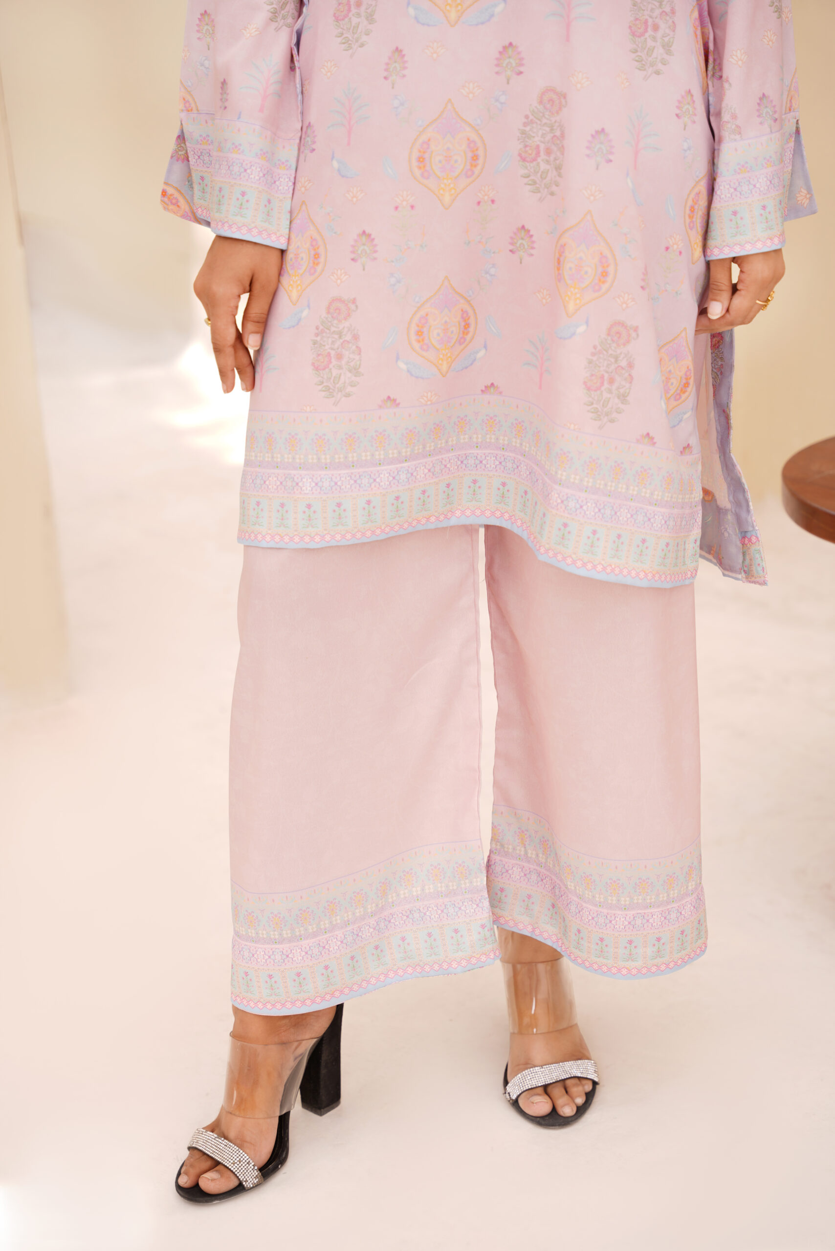 Exude refined charm with Sophia’s Closet’s Blush Radiance Printed Silk 2-Piece. Crafted from premium silk, this ensemble offers a luxurious drape and a feather-soft feel against the skin. The subtle blush pink base is beautifully complemented by intricate pastel motifs and a finely detailed border, adding a touch of timeless grace.